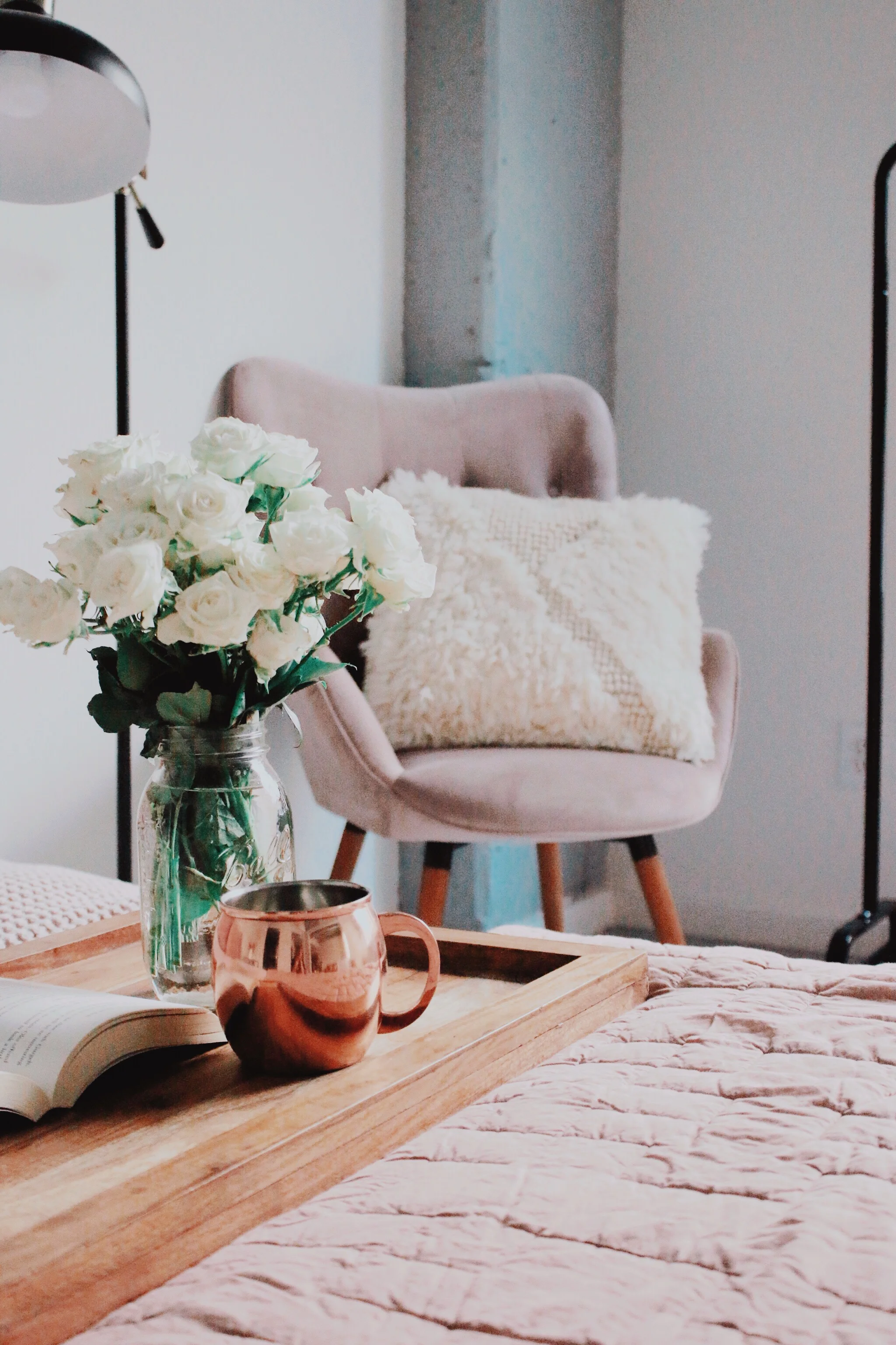 This has got my favorite photo of the whole setup! My gosh, that beautiful brick-textured rose quilt just steals my heart every time. Now I want a cream-colored one just to do another modern-luxurious look!
